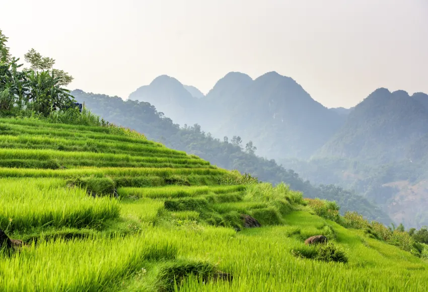 Your adventure begins in the peaceful setting of Mai Chau, where stilt-house villages are framed by golden rice fields and dramatic limestone cliffs. Walking out from your homestay or lodge, you'll follow a network of village trails shaded by acacia and banana trees. Along the way, you'll encounter local Thai villagers going about their daily lives—tending to their fields, weaving brocade by hand, or leading water buffalo through narrow paths. It's a living portrait of rural Vietnam.